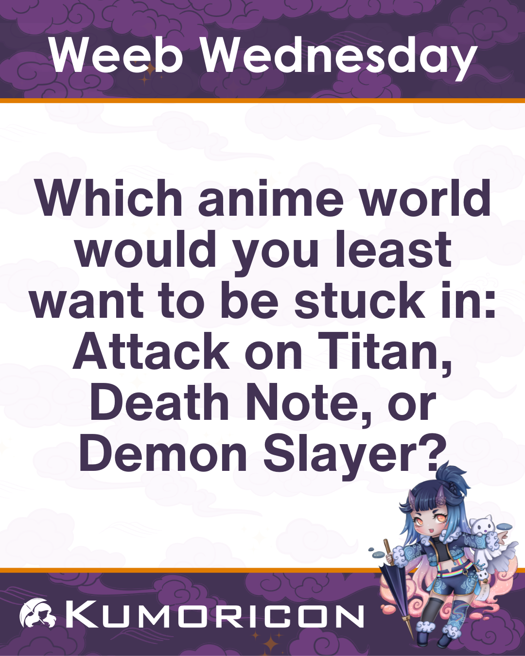 Weeb Wednesday: Which anime world would you least want to be stuck in: Attack on Titan, Death Note, or Demon Slayer? #Kumoricon #Kumoricon2026 #AnimeConvention #PDX #JapaneseCulture #OregonConventionCenter #PDXCosplay #PDXLife #PDXLove #AnimeCon #Otakus #ConventionReady #Otaku4Life