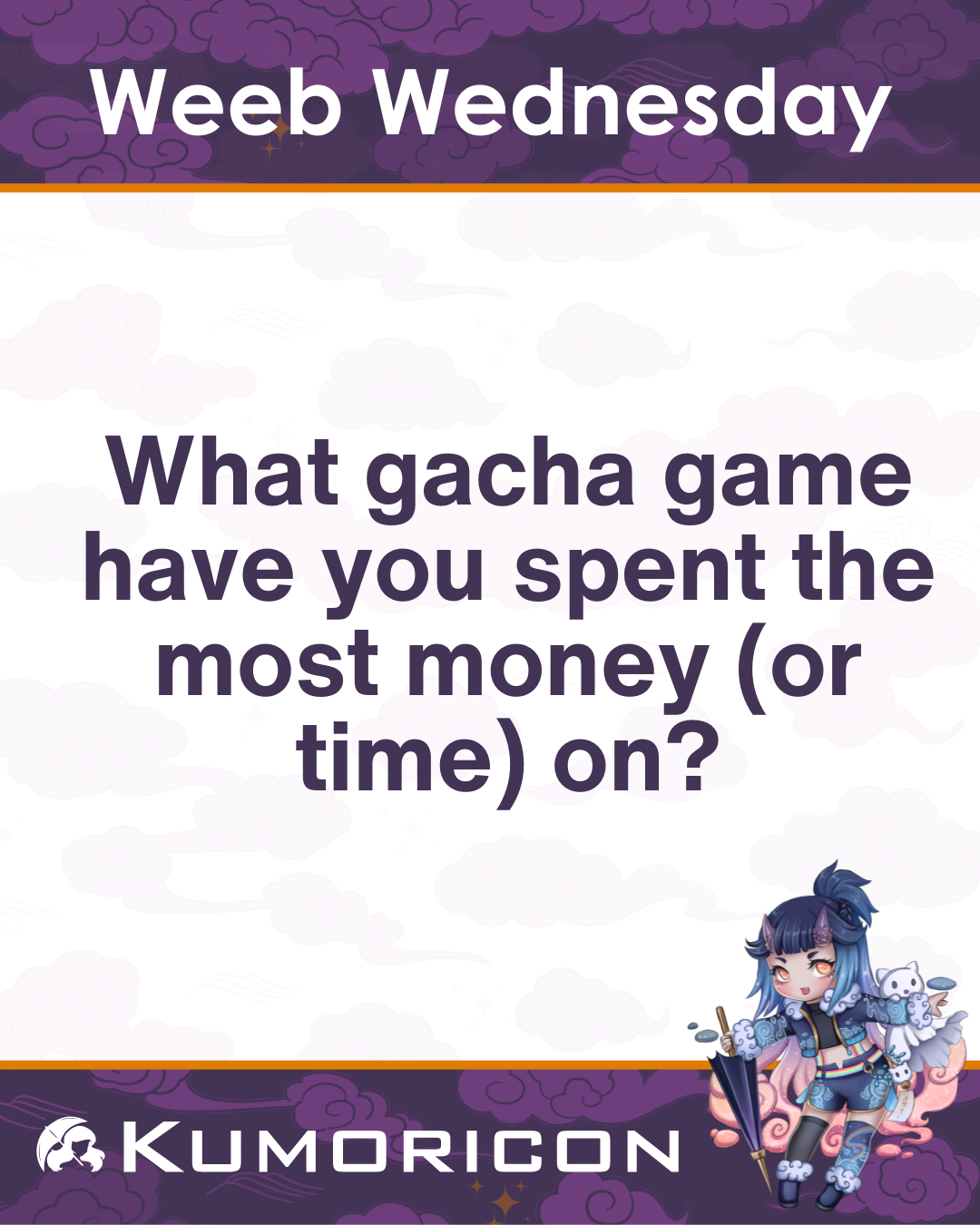 Weeb Wednesday: What gacha game have you spent the most money (or time) on? #Kumoricon #Kumoricon2026 #AnimeConvention #PDX #JapaneseCulture #OregonConventionCenter #PDXCosplay #PDXLife #PDXLove #AnimeCon #Otakus #ConventionReady #Otaku4Life