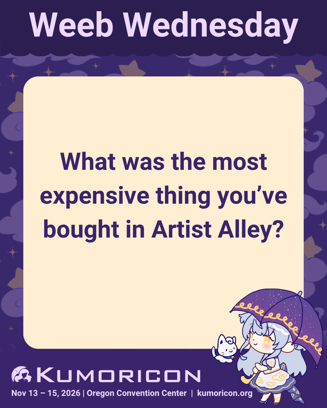 Weeb Wednesday: What was the most expensive thing you’ve bought in Artist Alley? #Kumoricon #Kumoricon2026 #AnimeConvention #PDX #JapaneseCulture #OregonConventionCenter #PDXCosplay #PDXLife #PDXLove #AnimeCon #Otakus #ConventionReady #Otaku4Life