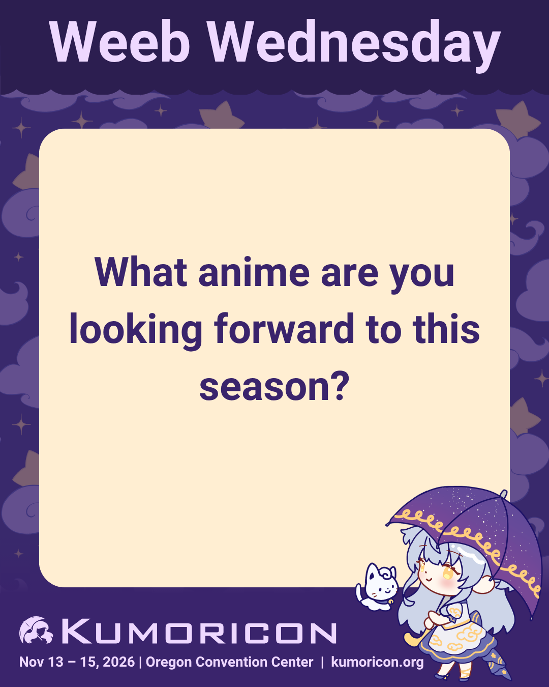 Weeb Wednesday: What anime are you looking forward to this season? #Kumoricon #Kumoricon2026 #AnimeConvention #PDX #JapaneseCulture #OregonConventionCenter #PDXCosplay #PDXLife #PDXLove #AnimeCon #Otakus #ConventionReady #Otaku4Life